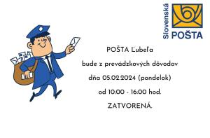Pošta Ľubeľa bude 15.03.2024 zatvorená v čase od 13:30 - 15:00 hod.