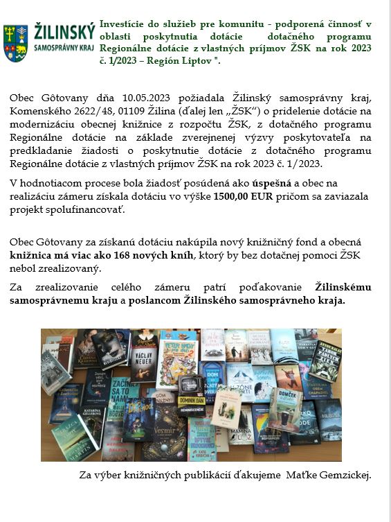 Tešíme sa, že sme získali dotáciu zo Žilinského samosprávneho kraja na nákup nových kníh do našej obecnej knižnice.
