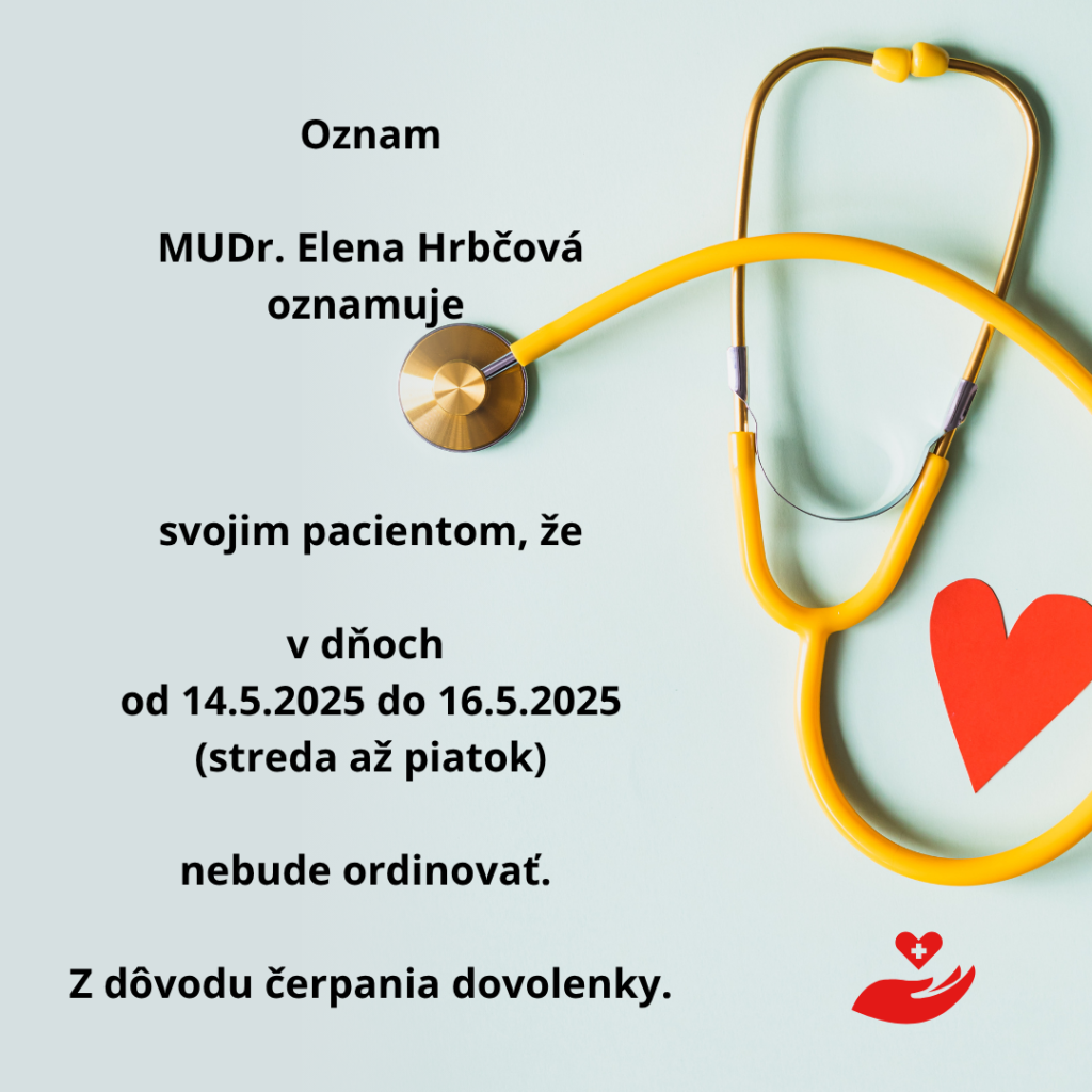 od 14.5.2025 do 16.5.2025 nebude ordinovať.
