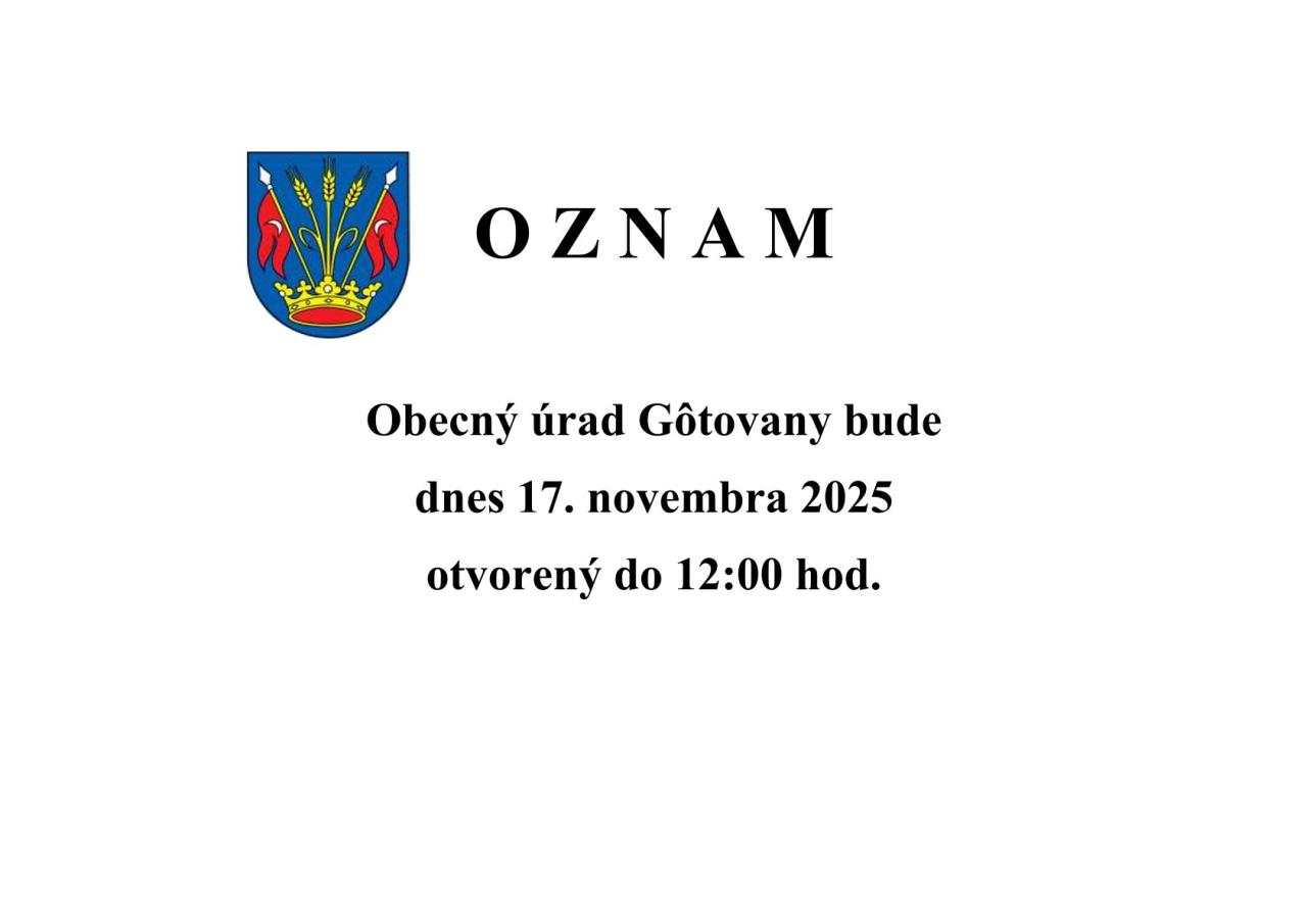 Obecný úrad Gôtovany bude dnes 17 novembra otvorený do 12:00 hod.