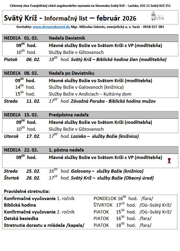 Rozpis bohoslužobných podujatí na mesiac február 2025