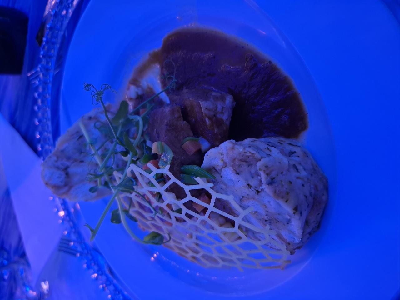 Hlavné jedlo: Pomaly dusené bravčové mäso, redukované na červenom víne, brunoise zelenina, podávané s karlovarskou knedľou.